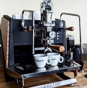 Für Vostok-Versionen mit maßgefertigtem Holz: Die Holzart des gewählten Siebträgergriffs wird geändert, und der Tamper wird mit einem Stahlfuß und einem Aluminiumgriff von ACS geliefert.