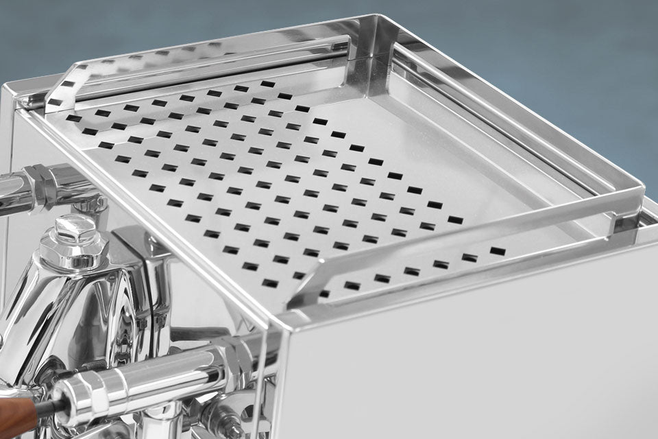 Edelstahlrahmen, Füße aus poliertem Aluminium, großer Tassenwärmer und praktische Abtropfschale.