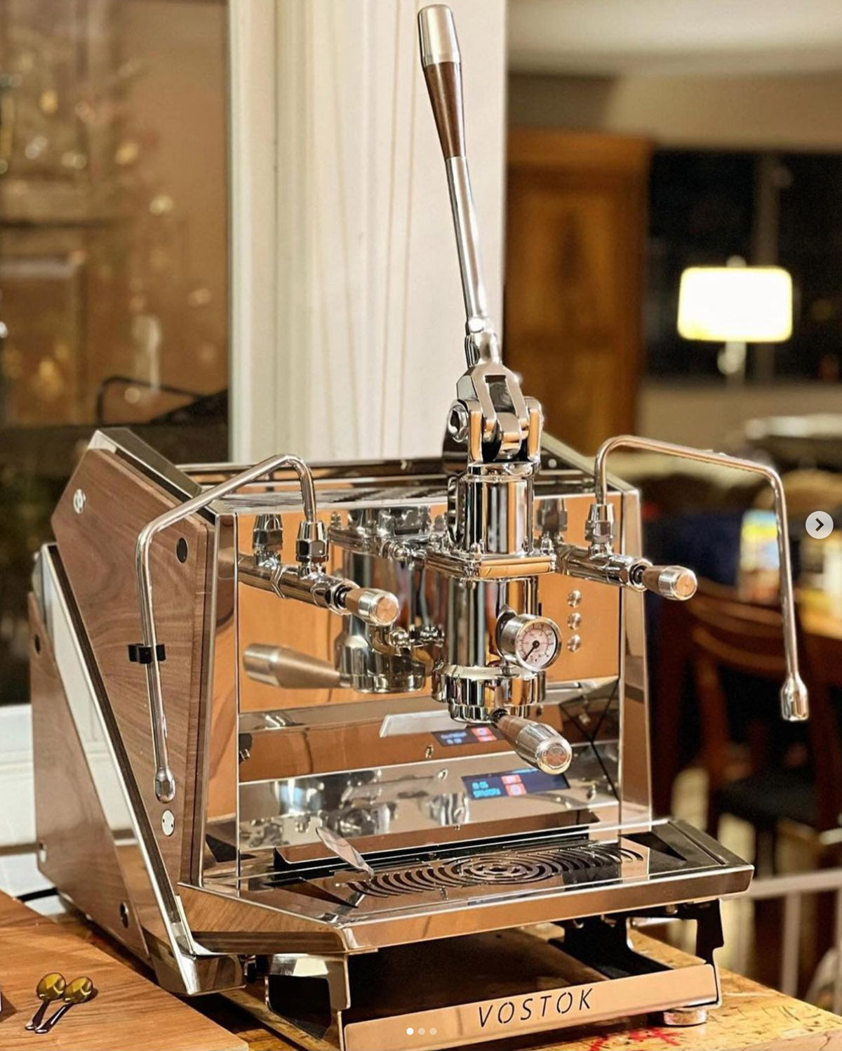 Für Vostok-Versionen mit maßgefertigtem Holz: Die Holzart des gewählten Siebträgergriffs wird geändert, und der Tamper wird mit einem Stahlfuß und einem Aluminiumgriff von ACS geliefert.