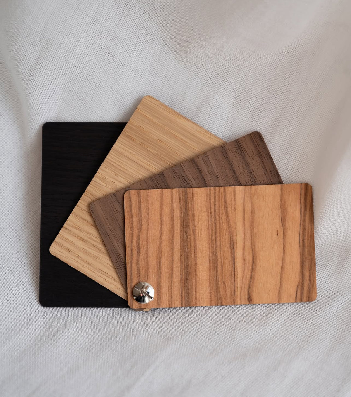 Die Proben sind dünn, behandelt mit demselben natürlichen Öl, das wir in unseren fertigen Produkten verwenden, und mit einer praktischen Metallschraube zusammengefügt.