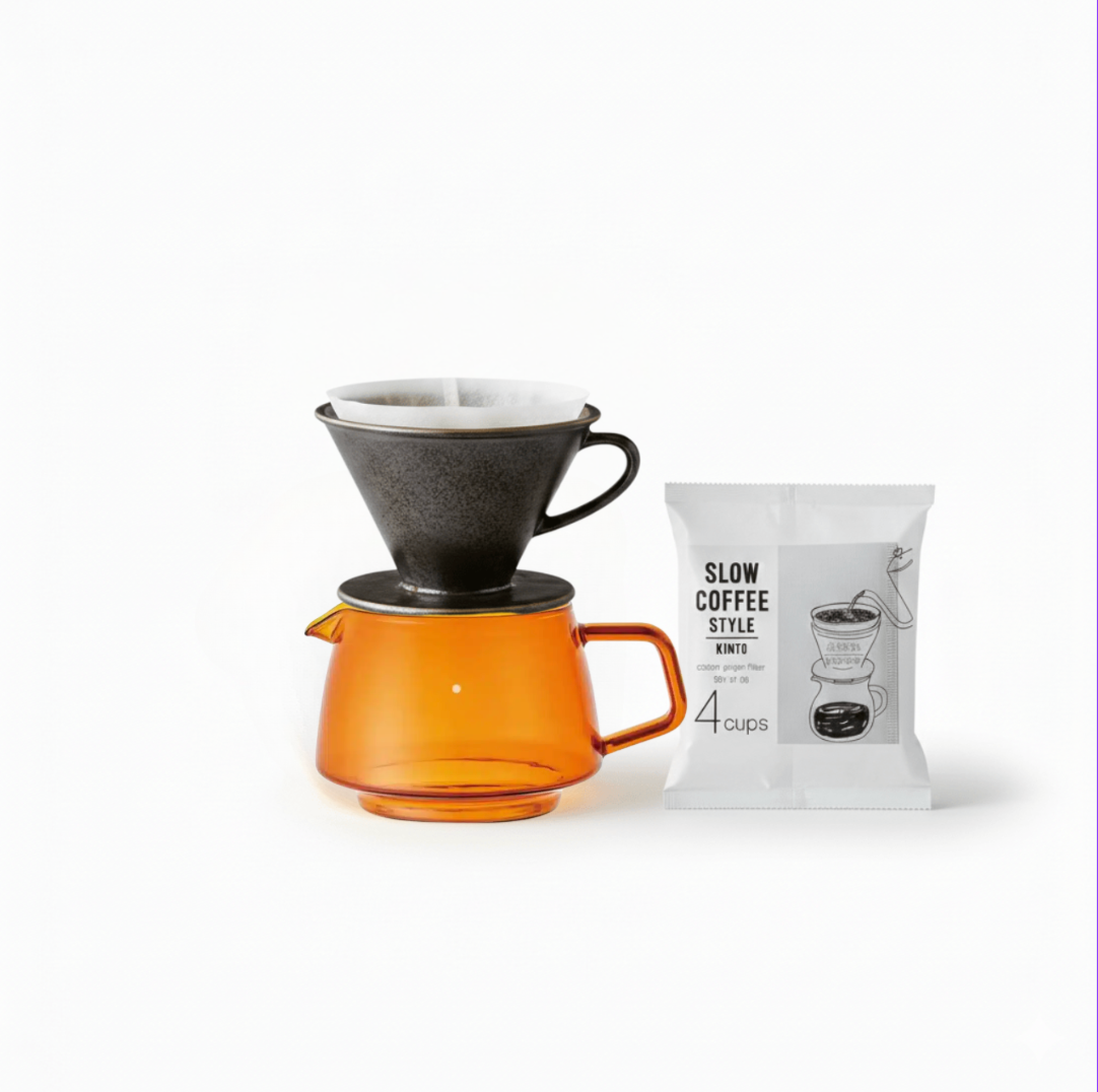 Kinto Slow Style Brühset für vier Tassen. Das Paket enthält eine 600 ml Kinto Sepia Glaskanne, einen keramischen Slow Style scs-s01 Filter für 4 Tassen sowie 60 Filter. Perfekt geeignet für alle, die ein schlichtes Aufgieß-Set suchen, das sofort einsatzbereit ist!
