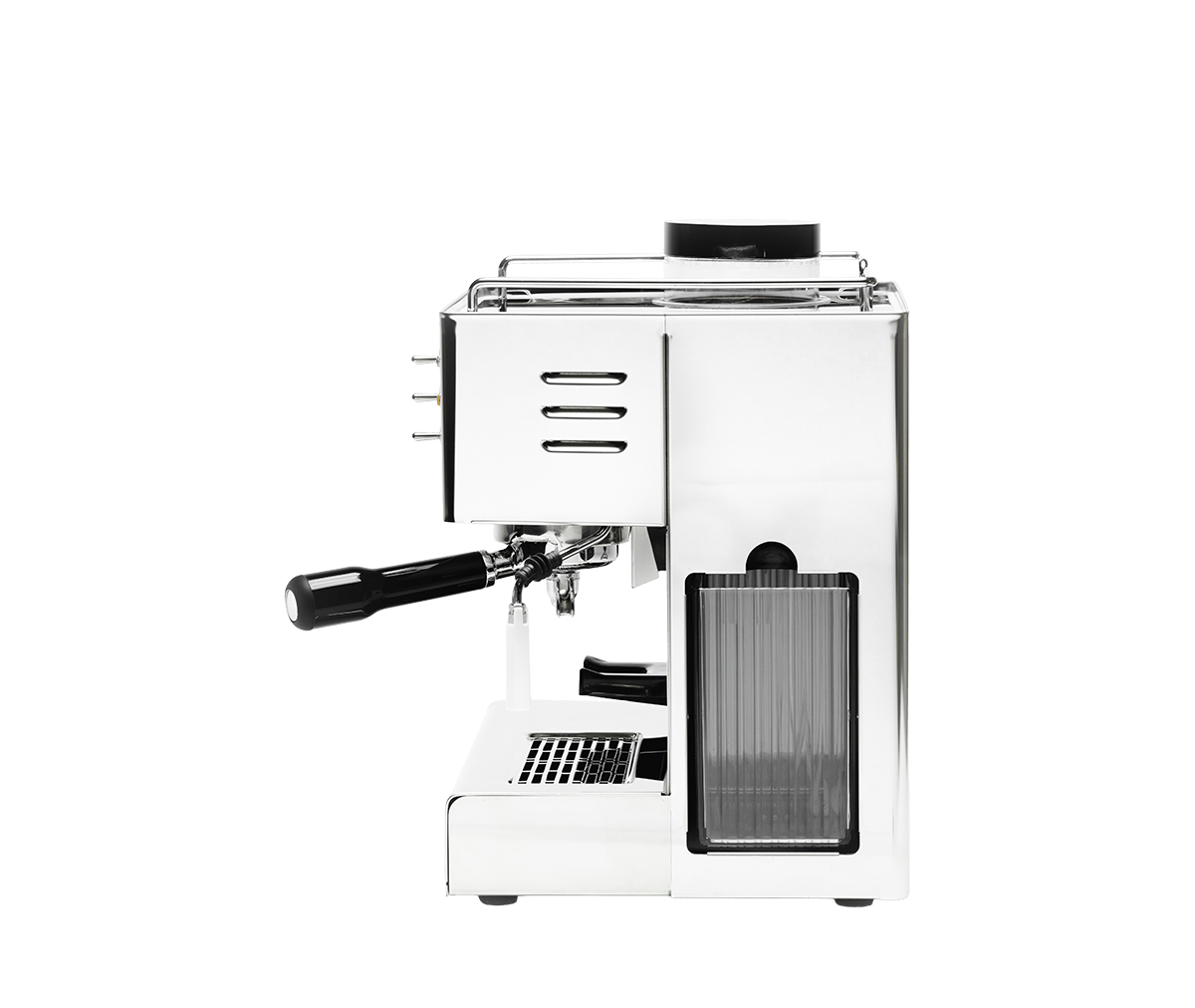 Die Maschine wird mit klassischen Hebelreglern, klaren Kontrollleuchten und einem integrierten Tamper gesteuert. Der seitliche Wassertank mit 1,8 Litern erleichtert das Nachfüllen.