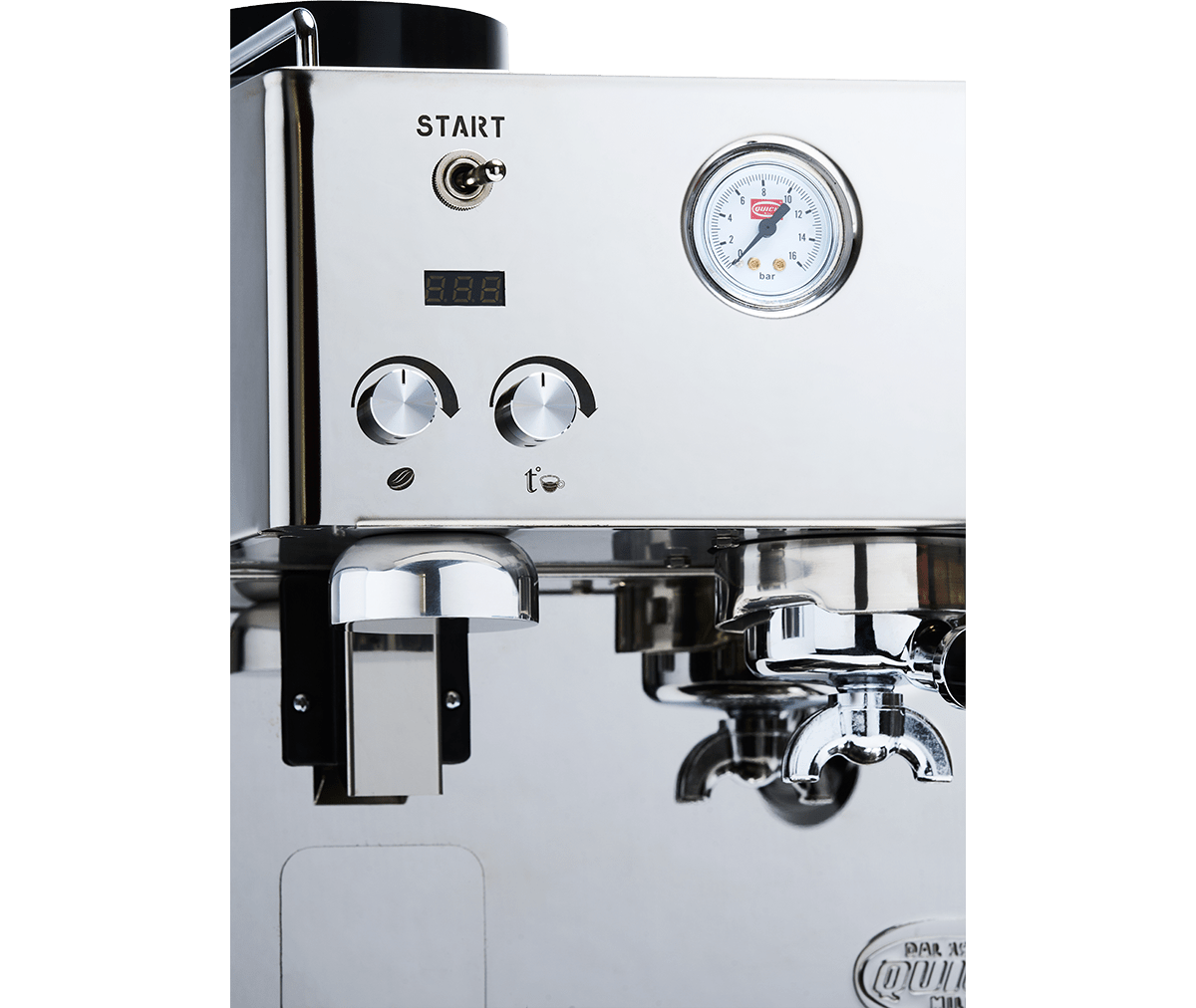 Material: Vollständig aus Edelstahl; Quick Mill-Brühgruppe mit O-Ring; Anti-Verbrüh-Dampflanze mit Aerator