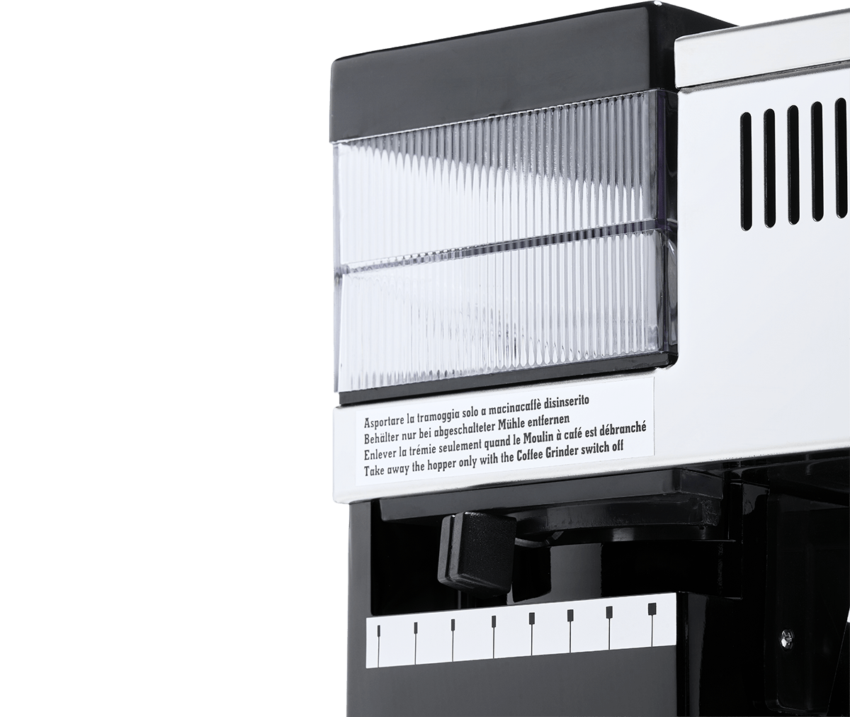 Mühle: Integrierte Mühle mit 43 mm flachen Mahlsteinen; stufenlose Mahlgradeinstellung; Dosierknopf